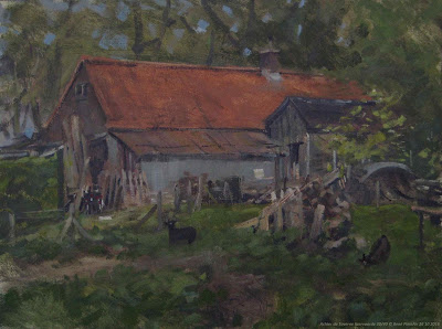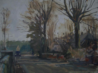 Yesterdays effort, somehow it does gave me a feel of those rural road in Ireland or England but this is a very small dirt-road so no comparison really. The fun part is that you are reasonably sheltered for the wind, although when it guts through the "lane" it blows every clean as well, which it did during this session. I painted this scene twice for that matter.